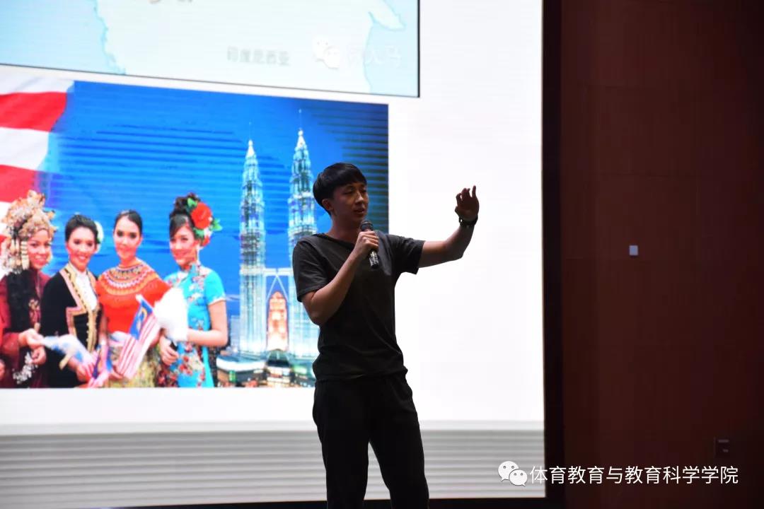 随后,来自马来西亚拉曼大学的蔡志先、余贤惠、陈建南、黄书峰四位学生发言。他们介绍了马来西亚的气候环境、民族和文化、宗教信仰、岛屿文化和美食。他们学习的专业是体育运动科学,通过视频和图片,展示了专业课上运动的实验仪器以及上课模式,加深了肉视频