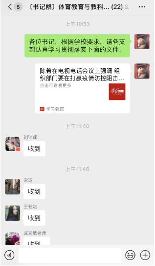 充分发挥基层党组织战斗堡垒作用和党员先锋模范作用,学院要求各基层党支部通过网络方式组织全体党员跟进学习习近平总书记重要讲话精神和党中央决策部署、市委和市教育两委防控疫情工作要求,增强“四个意识”、坚定“四个自信”、做到“两个维护”,提高政治判断力,切实把围绕打赢疫情防控阻击战作为当前最重要的工作,确保学校党委决策部署贯彻落实,让党旗在防控疫情斗争第一线高高飘扬。