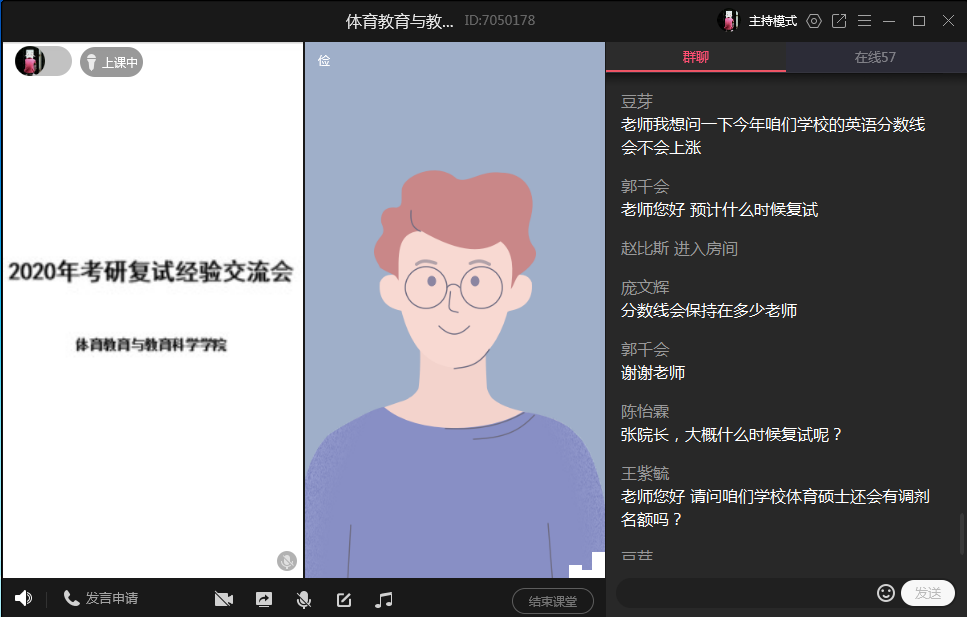 张运亮老师从硕士研究生复试的流程、录取政策等方面做了专业解读,普及了研究生复试的相关知识,并鼓励同学们不要受疫情影响,摆正心态、克服困难、积极备战,并采取线上答疑的方式为同学答疑、解惑。时庆利、温慧娴、徐安3位同学则分别根据自身研究生复试经历从笔试、面试和技能展示三个层面分享了他们的经验和体会。