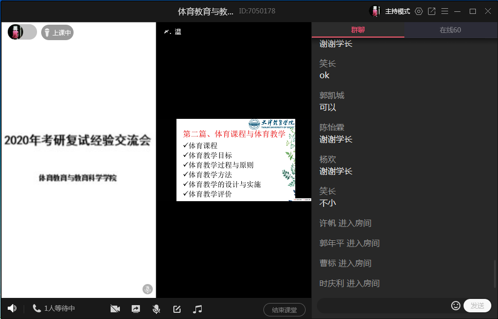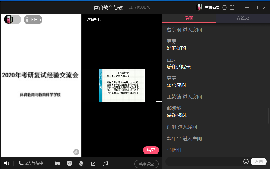 促进2020届毕业生就业创业工作实施方案》文件精神,切实做好学院2020届毕业生就业创业工作,提高学院考研率、就业率。4月16日下午15:30,学院通过网上直播的形式召开2020年研究生复试经验交流会。本次会议由学院副院长张运亮老师主讲,2019级研究生时庆利、温慧娴、徐安等3名学生分享研究生复试经验。2016级通过研究生入学考试初始的学生参加了交流会。2016级辅导员、年级主任钱长浩主持。