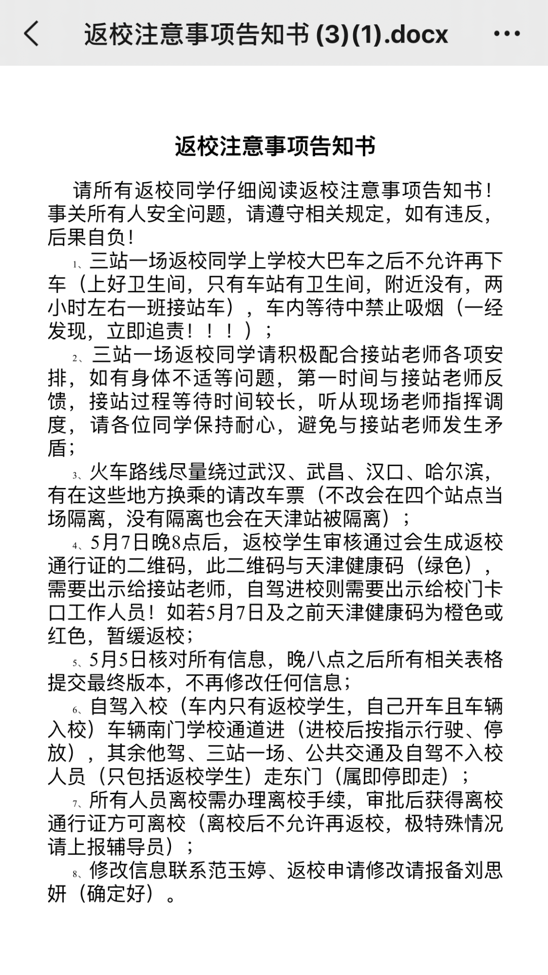 此后,按照学校相关管理制度和学院部署要求,毕业班辅导员通过线上会议、微信群通知、返校事项告知书等形式对于第一批返校学生开展返校疫情防控知识培训工作。对于同学们返校前的准备工作,返校途中的防护工作,返校后的注意事项,以及毕业生相关手续的办理等都做了提示和说明。对于同学们提出的问题也一一给予解答。通过培训,向同学们讲明了晨午晚检,宿舍通风,食堂错峰就餐等返校后管理制度,向同学们介绍了宿舍发现病例报告、隔离流程和应急处置预案等等知识。不仅加强了同学们对于疫情防控重要性的认识、增加了同学们疫情防控知识,也为学生返校后做好疫情防控工作打下坚实的基础。