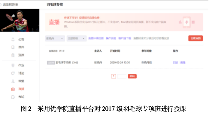 在充分利用学院购买的优学院平台进行教学的同时,本人还广泛借鉴其他平台进行教学,如welink, 腾讯会议等。为更好地监督学生上课状态及投入情况,以及检查学生技术动作的规范性,经过比较,本人主要选择腾讯会议,辅以优学院进行授课。