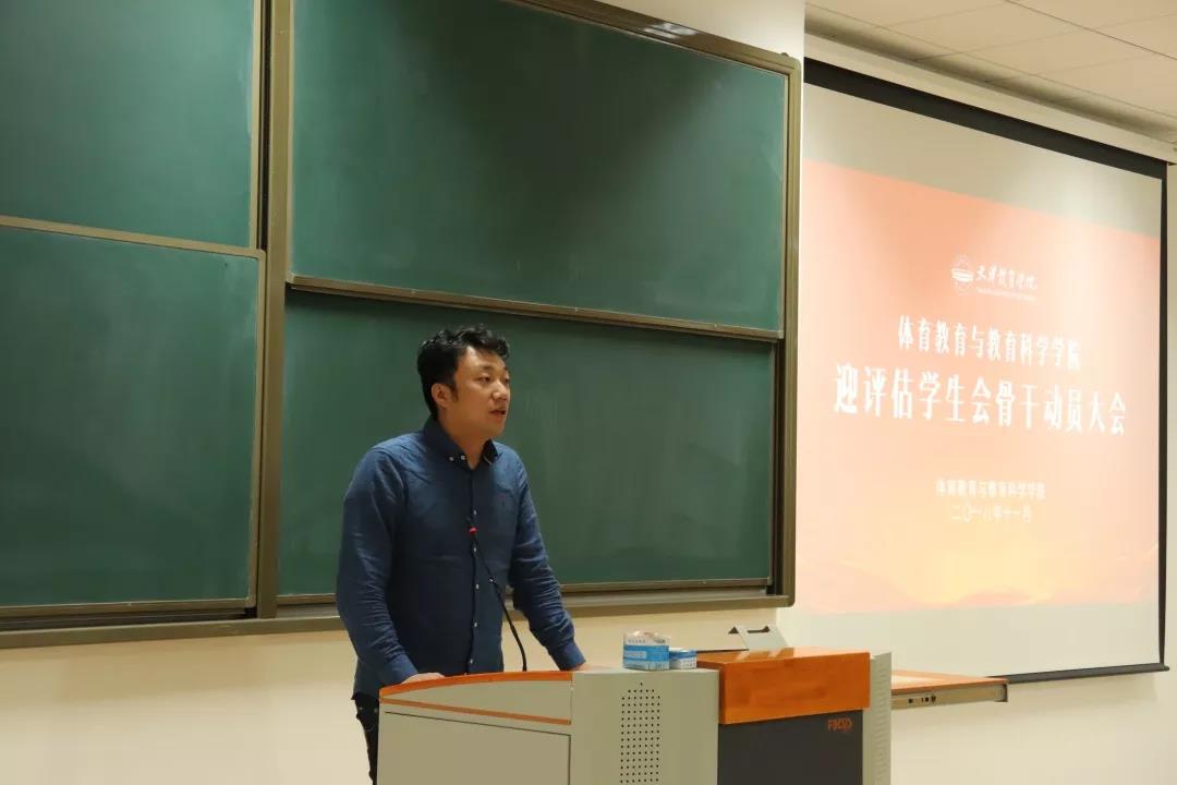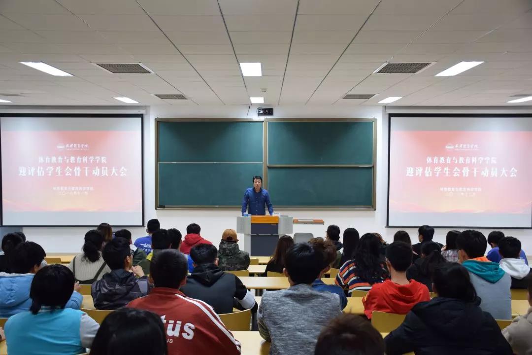 为迎接本科教学工作审核评估,11月2日,体育教育与教育科学学院在教学楼A501召开迎评估学生会骨干动员大会,团总支书记张明主持会议,全体学生会成员参加。