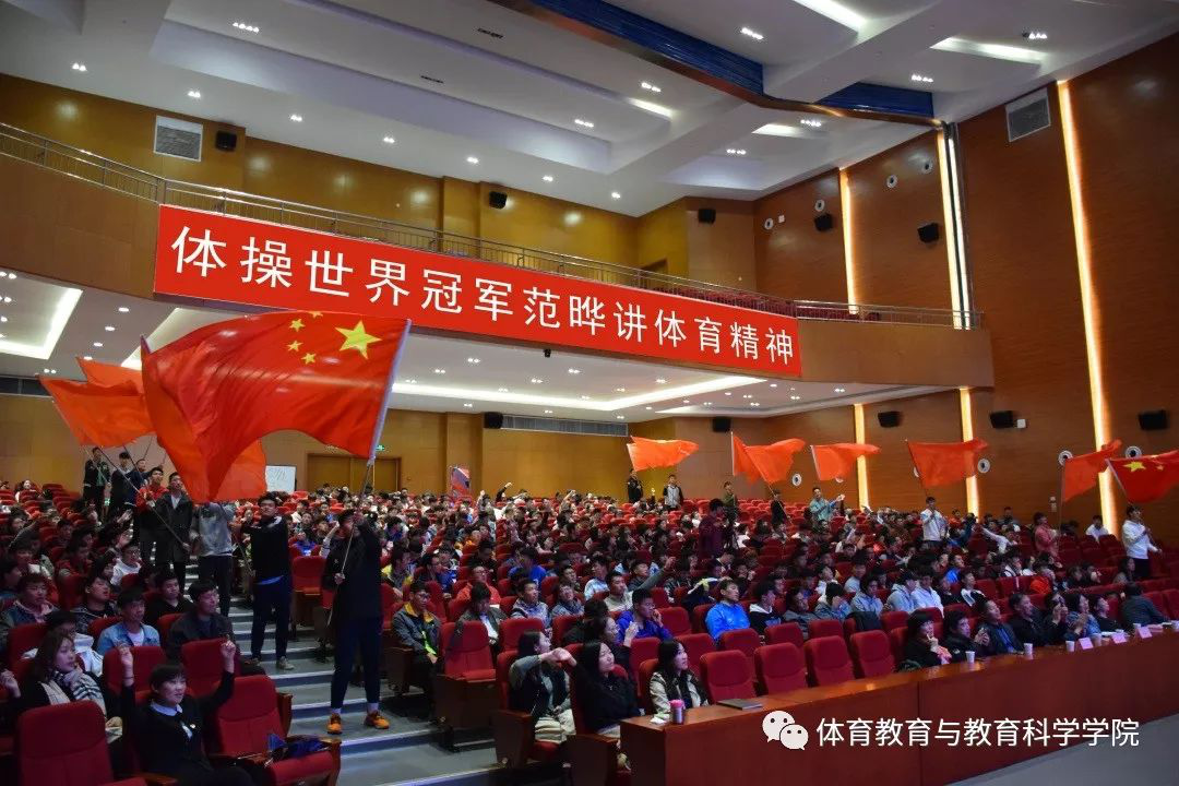 2019年10月28日下午2点,体操武术教研室《体操》课程思政课题组邀请了体操世界冠军范晔在大学生活动中心做了体育精神的宣讲。参加此次讲座的有“课程思政”建设指导组专家邵淑月教授、孙慧敏教授、陈尚伟教授,马克思主义学院高永强院长,体育教育与教育科学学院张运亮副院长,“课程思政”训练营的各位营员们,体操武术教研室全体教师以及体育教育专业2017级和2018级本科生一同聆听了冠军的宣讲。