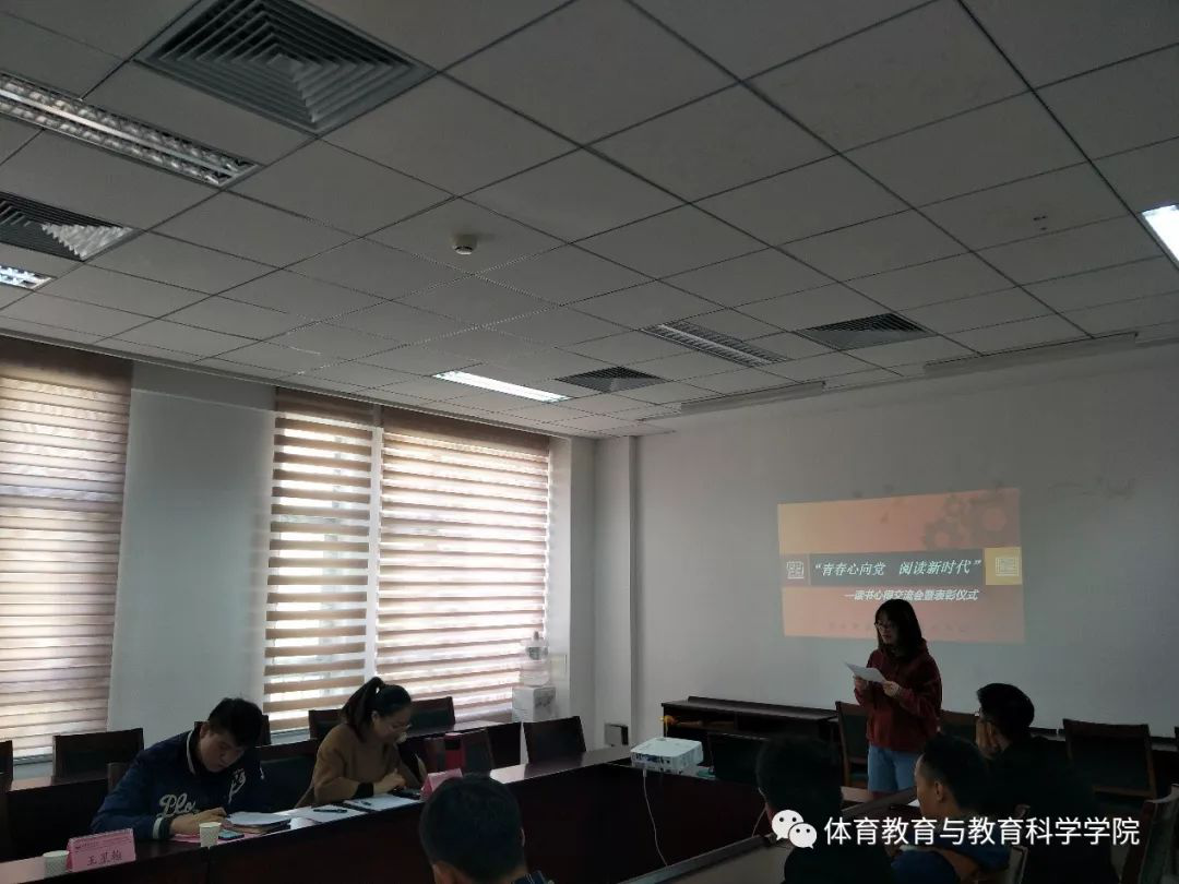 10月28日上午,体育教育与教育科学学院在特教楼507举行了“青春心向党 阅读新时代”读书活动心得交流会暨表彰会。辅导员杨奕娇老师、王星翰老师出席了此次活动。活动由学生孔垂鑫主持。