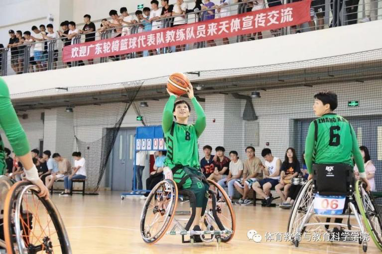的学生体验轮椅,并与广东队队员们进行了一场3v3的半场篮球赛,让普通人体验轮椅篮球与普通篮球的不同。