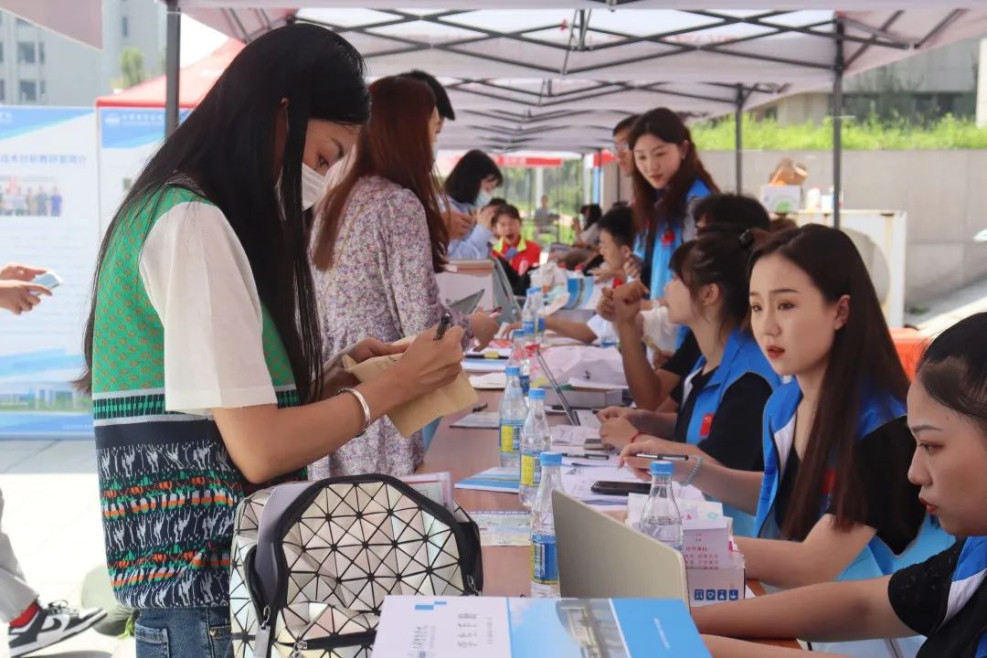 迎新现场,志愿者热情接待新同学,提供报到引导、行李搬运、解答咨询等服务。