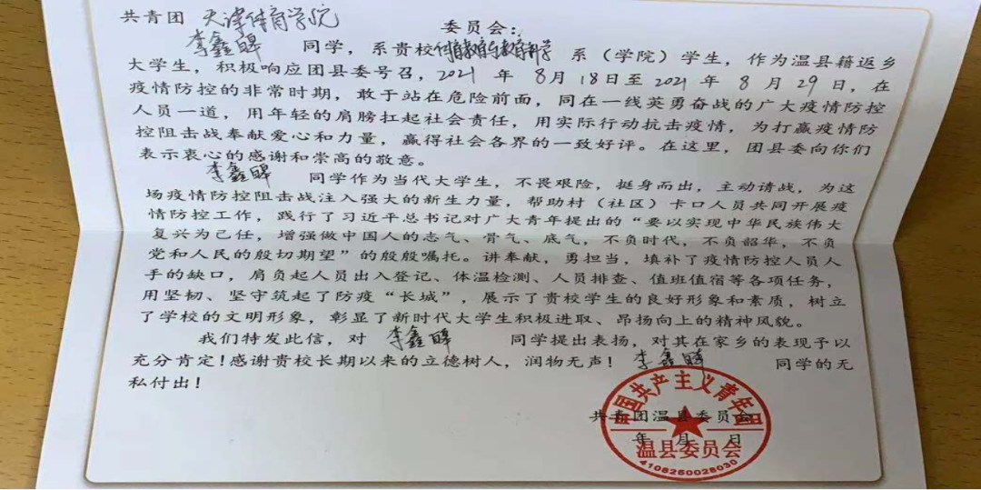 体育教学专业1901班的研究生李鑫皞同学在暑假期间,参与河南省焦作市温县城区疫情防控志愿者服务工作,主要负责发放卫生用品、宣传疫情防控、卡点值班和排查从高风险地区回来人员等工作,中国共产主义青年团温县委员会发来感谢信,对李鑫皞同学在家乡的表现提出表扬。感谢肉视频