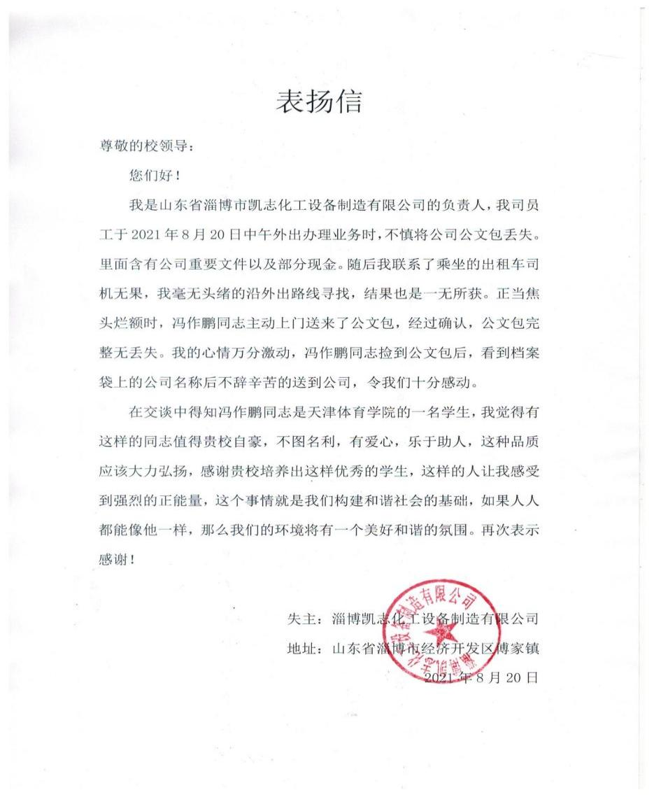 一名学生冯作鹏为体育教育与教育科学学院体育教学专业2019级研究生。2021年8月20日中午,他在山东省淄博市凯志化工设备有限公司员工办理业务路上捡到一个公文包,看到档案袋上的公司名称后立马主动联系该公司,并亲自送到公司归还失主。该公司负责人对肉视频
