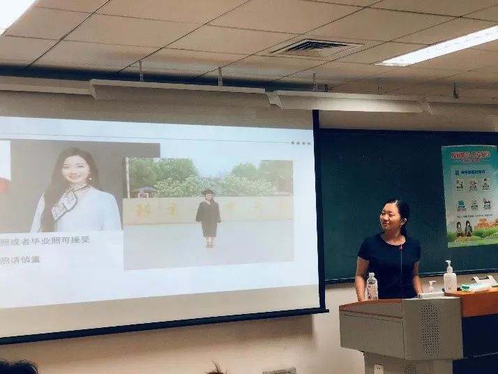 活动开始,刘稀月老师展示了几张照片,刘老师强调:“个人求职简历就是名片,简历照片的选择一定要特别的慎重,不管是人物的穿着还是背景的选择,都应该特别的注意,为了让简历看起来正式,去照相馆拍摄专门的形象照也是可以选择的。”