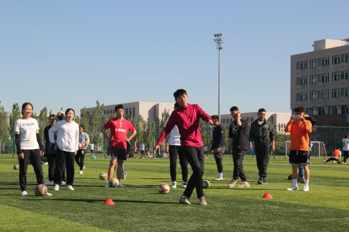 活动开始,王炜华老师向同学们介绍了一些足球运动的基本规则,并亲自进行动作示范,生动形象地描述动作要领,带领同学们完成了脚内侧踢球的学习。紧接着,“球场保龄球”、“天旋地转”等小游戏也有条不紊地开展起来,张明老师和孙志文老师也参与其中,师生们各施绝技,那精湛的脚法、犀利的射门以及精彩的配合博得现场同学们的阵阵欢呼与掌声。