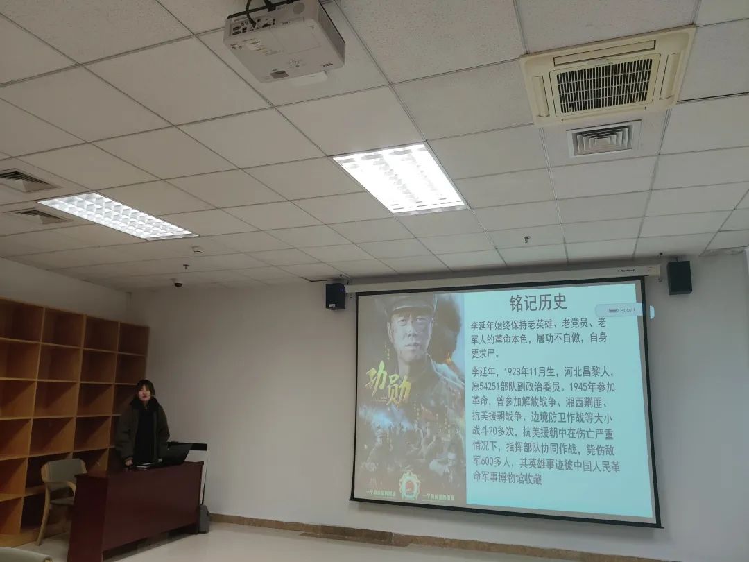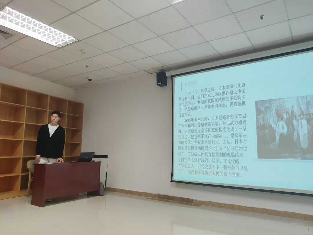 历史更迭,我们已经成为历史年轮的一部分,不断经历着时代的变更。活动开始,马智慧同学向我们介绍了曾参加过解放战争、抗美援朝战争、边境防卫作战等大小二十多次战斗的原54215部队副政治委员李延年先生,警醒大家出生在幸福的时代,我们没有理由不去努力。许鑫浩同学带大家回顾了一二·九抗日救亡运动时期的那段峥嵘岁月。