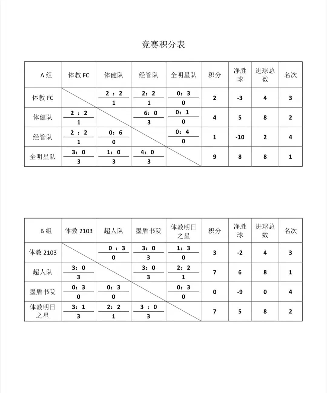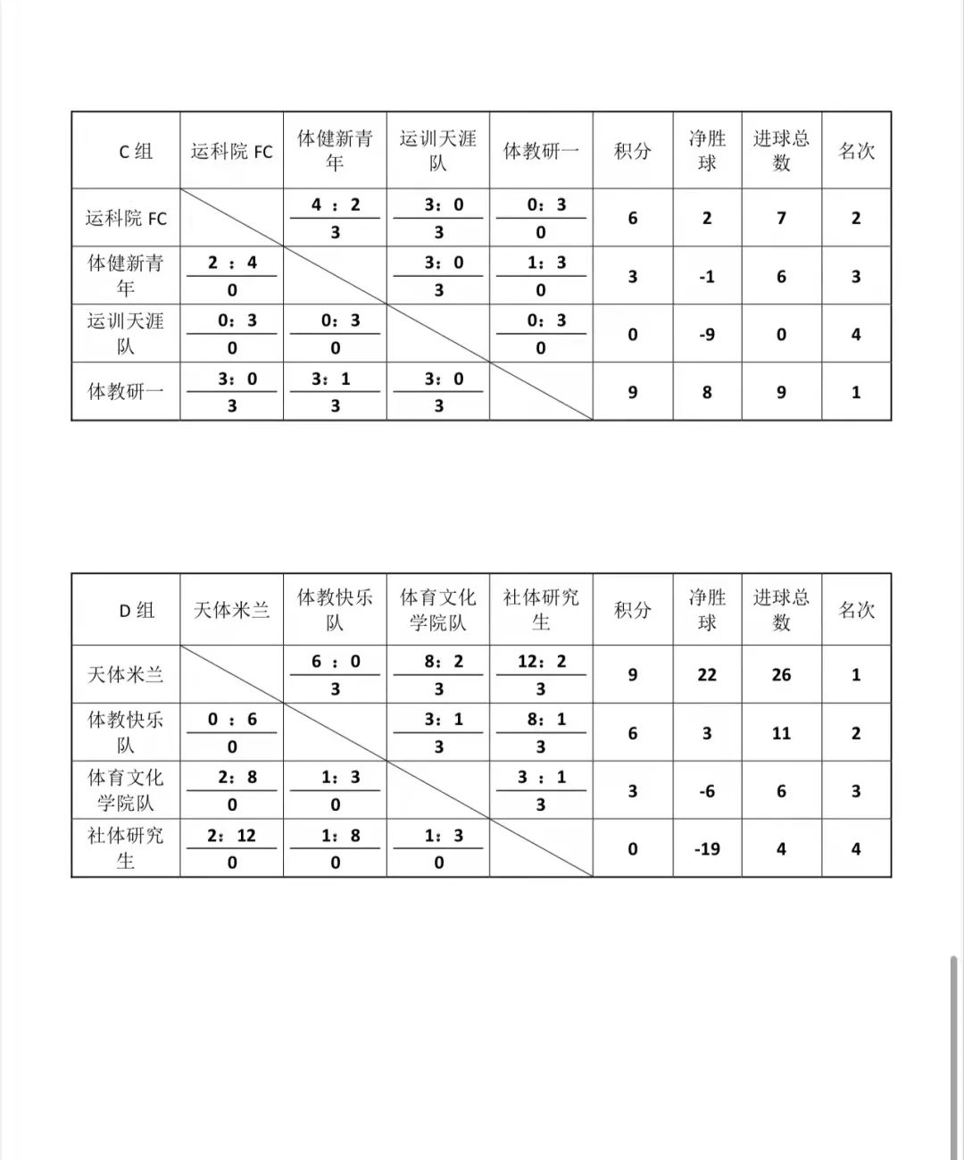 在小组比赛中,运动员都发挥出了自己最好的水平,小组赛结束后每组取前两名进入淘汰赛。分别为A组的“全明星队”和“体健队”;B组的“超人队”和“体教明日之星队”;C组的“体教研一队”和“运科院FC队”;D组的“天体米兰队”和“体教快乐队”。