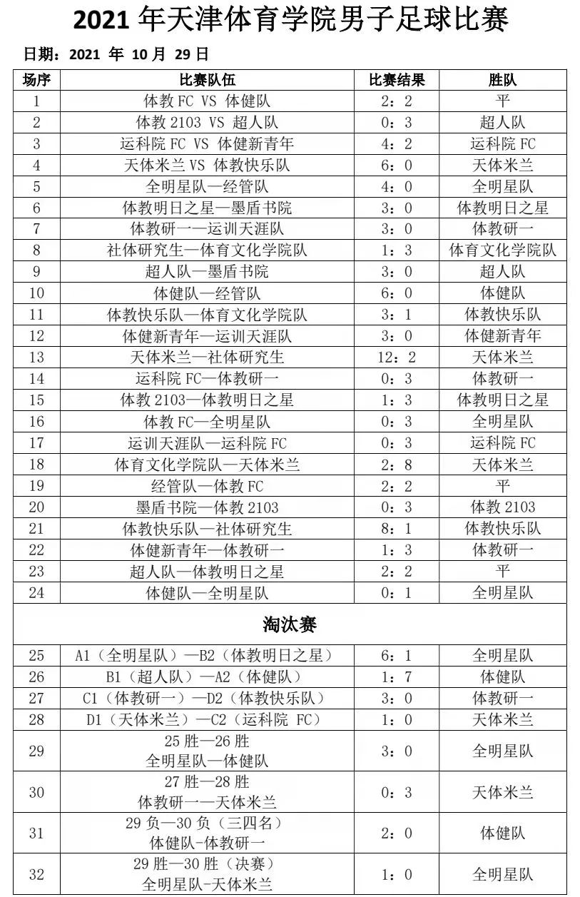 2021年10月29日,由体育教育与教育科学学院主办,足篮排球教研室承办的2021年肉视频 校园“十一人制”男子足球赛,历时10多天比赛圆满落幕!本次比赛在天津体院十一人制足球场举行,有16支参赛队伍,近300名学生参赛,共计32场比赛。
