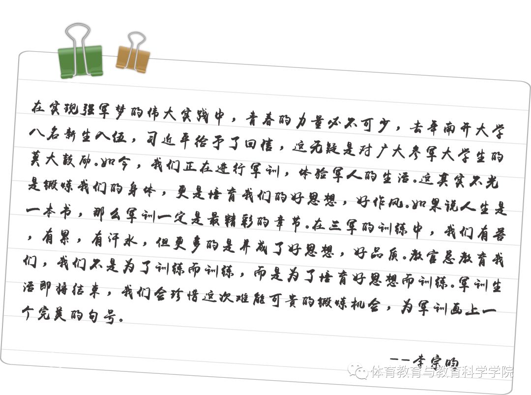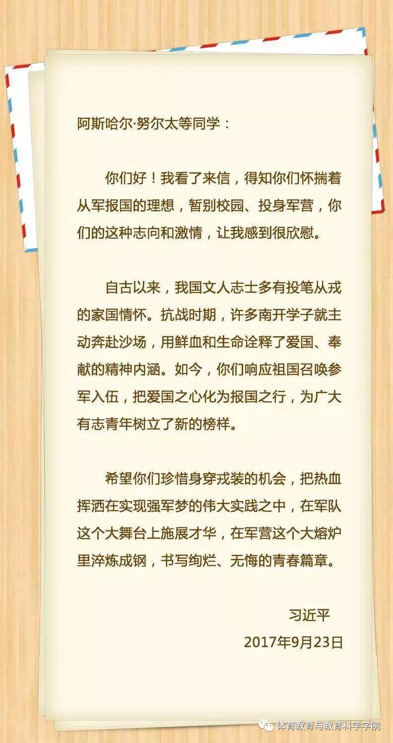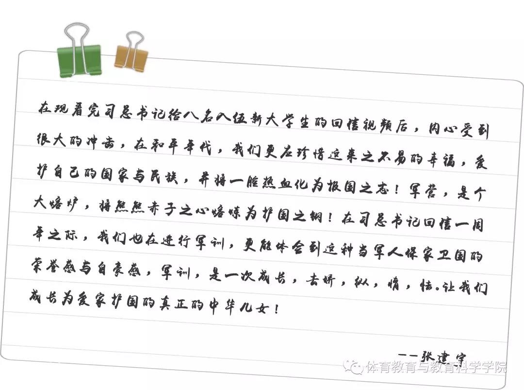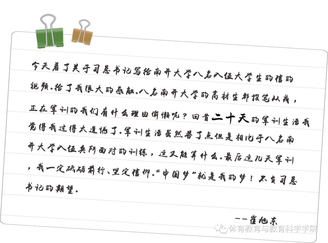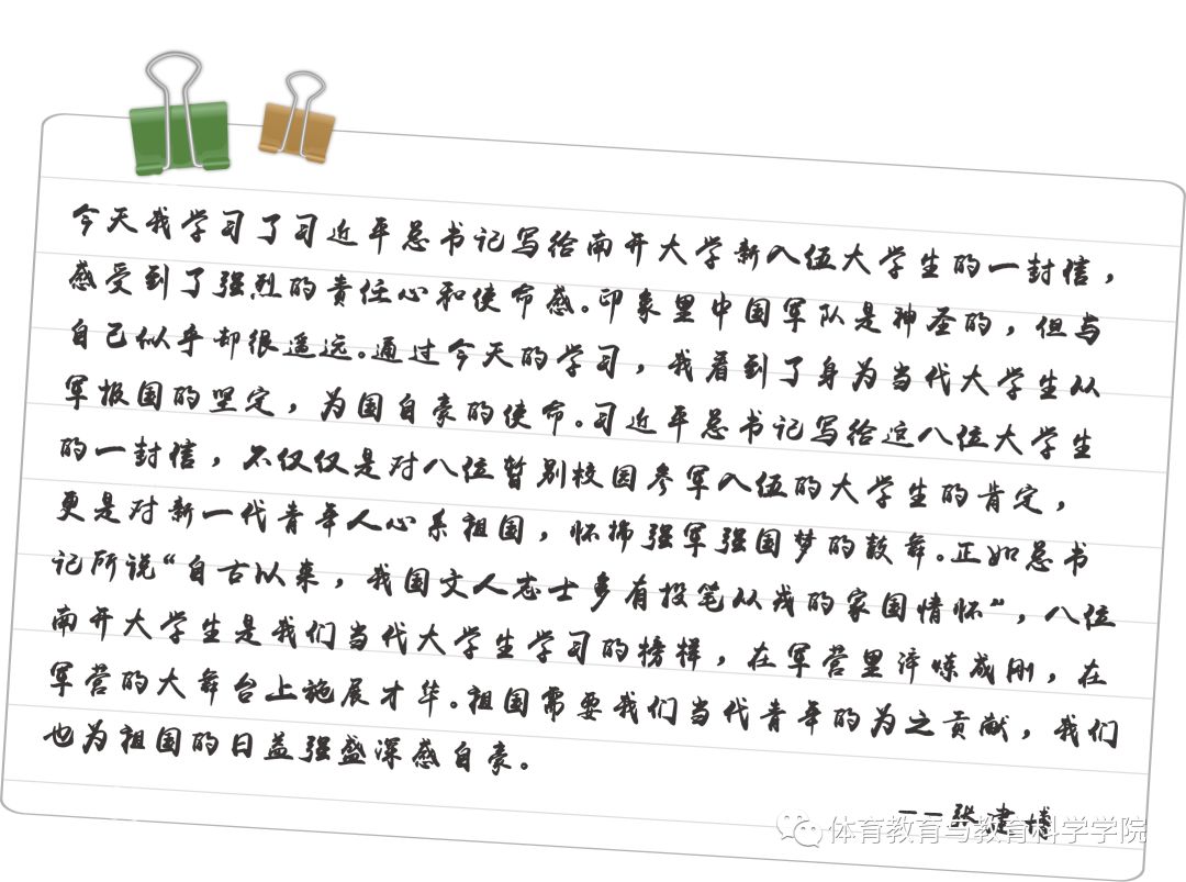 “同学们通过学习习总书记写给南开大学入伍的八位大学生的一封信,对军队有了更多的了解,看到自身的方向,而在体育教育与教育科学学院同样有许多有志青年选择了参加军队,去实现自我更大的价值,完成对强军强国梦的践行。国家的安危,民族的强大,需要一个个热血青年的责任心,需要一代青年的前赴后继的贡献。