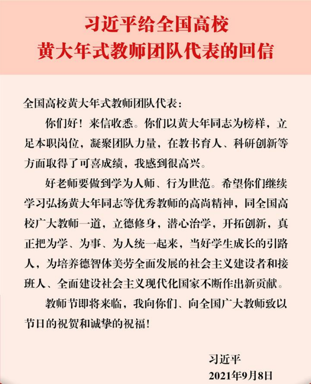 新华社北京9月9日电 在第三十七个教师节来临之际,中共中央总书记、国家主席、中央军委主席习近平9月8日给全国高校黄大年式教师团队代表回信,对他们寄予殷切期望,并向全国广大教师致以节日的祝贺和诚挚的祝福。