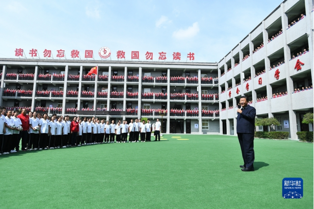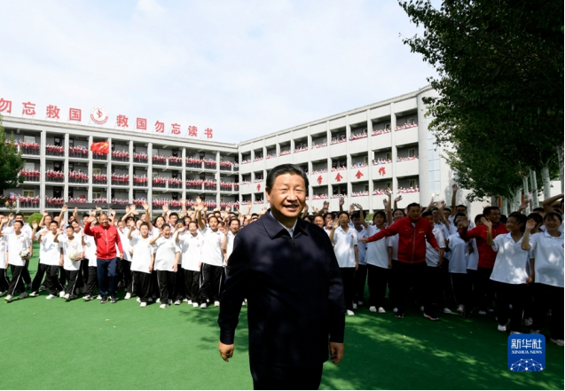 9月13日至14日,中共中央总书记、国家主席、中央军委主席习近平在陕西省榆林市考察。这是14日上午,习近平在绥德实验中学考察时,同师生亲切交流。新华社记者 谢环驰 摄