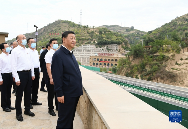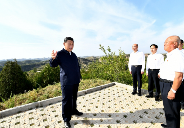9月13日至14日,中共中央总书记、国家主席、中央军委主席习近平在陕西省榆林市考察。这是13日下午,习近平在米脂县银州街道高西沟村龙头山山顶,考察黄土丘陵沟壑区综合治理情况。新华社记者 谢环驰 摄