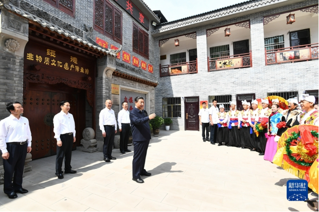 9月13日至14日,中共中央总书记、国家主席、中央军委主席习近平在陕西省榆林市考察。这是14日上午,习近平在绥德县非物质文化遗产陈列馆,同群众亲切交流。新华社记者 谢环驰 摄
